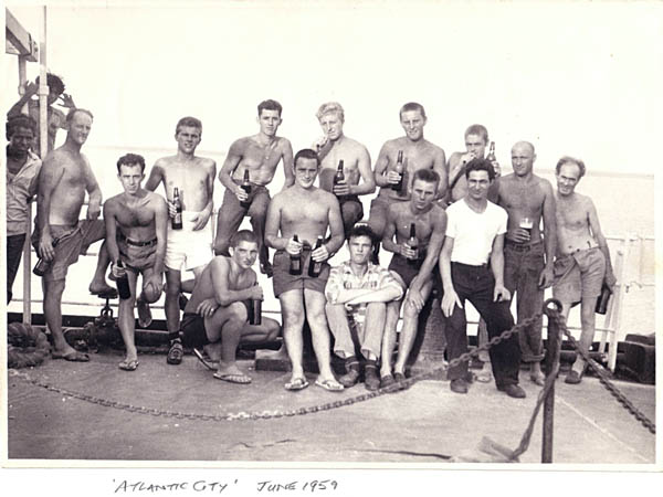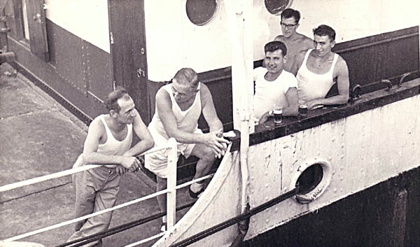 1953. From left are Jack Chatten 3/E, Steve Willis C/E, Alan Snowden Electrician and Don Parton 2/E.