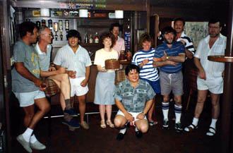 Capt Bob Baker, Elect Keith Bean, [2nd cook] Elaine Deschamps, (wife of Paul Deschamps) C/O Ian Stutt, Cook Pancho, Carole Baker, 2/E PJ Prendergast, Ch Stwd. Pete Mules, R/O Paul Bidmead. Copyright © Mike Cox. |