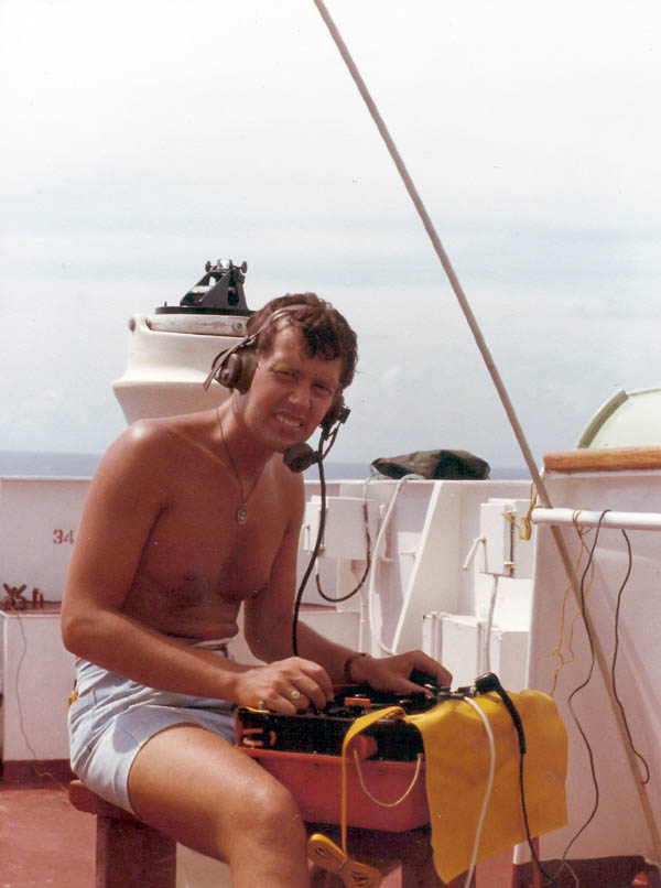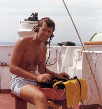 Dave Thomson, radio officer, testing the lifeboat radio.