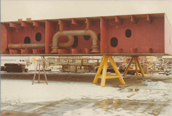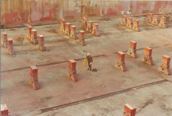 | After the previous ship has been floated out of the building dock the water is pumped out and the blocks are lined up ready for the next ship. | ![]() |