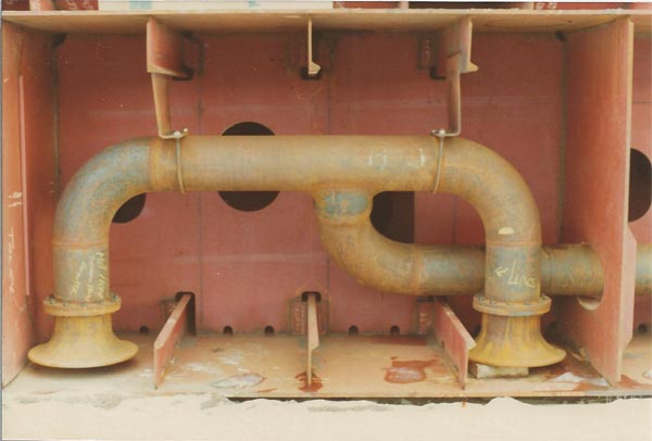 | This is a close up view of typical arrangement of main ballast suction pipes with cast iron bell mouths. Bell mouth is 80mm above the plating, but stripping suction (not shown) is at aft end of the tank and that bell mouth is 15mm above the plating. All photos copyright © Reardon Smith Ships. | ||