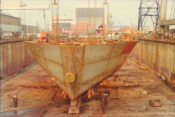 When the lining up of the blocks is completed the aft section is placed in the dock and carefully aligned.