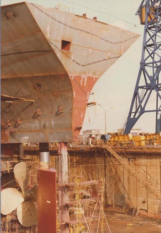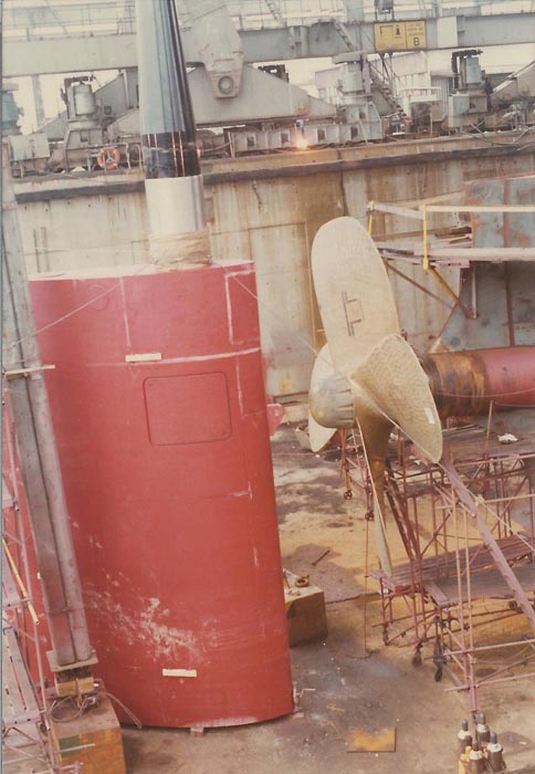 The rudder is completely built up under cover in the fabrication shed and the rudder stock is also fitted. When required it was brought out into the building dock and put into position ready for the upper after deck to be lowered into position over the rudder stock. In this photo the rudder assembly is aligned and in position. |