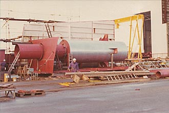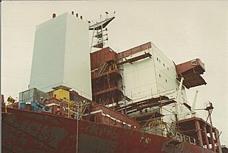 | On the left is one section of the Bridge housing with another just behind it. On the right is the funnel being assembled around the exhaust gas boiler. | ||