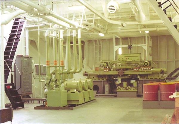 Looking aft to steering gear room. Left is ladder to poop deck. Right is storage for oil drums. Ladder on right is access to boiler flat. In the foreground are hydraulic pumps for aft mooring winches. This photo was taken on ship 887 and different pumps are fitted on the Eastern City. |