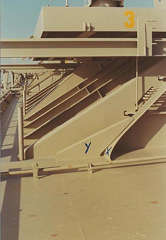 | The left photo shows the hydraulic Staffa motor. On the right photo X and Y show new design brackets to prevent fractures found on earlier hatch covers of this type. | ||
