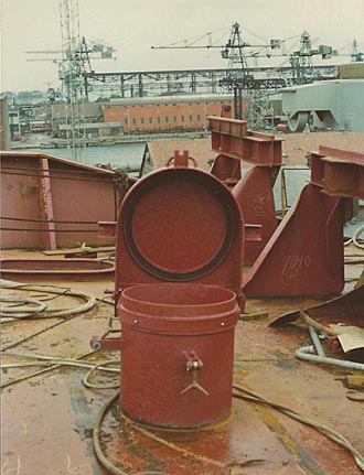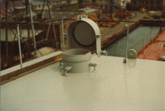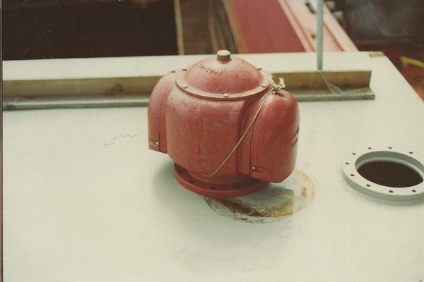 | The left photo shows the pressure release valve fitted to floodable hold No.4. The right photo shows the air vent which is fitted to all hatches. | ||