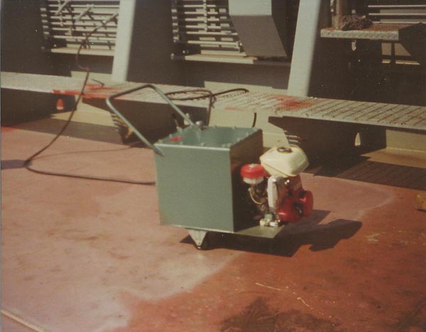 The two photos above show the emergency pump for operating hatches in case of failure of the main hydraulic pumps. It is driven by a Honda petrol engine. The photo on the right shows the hatch jack at No.1 hatch in the up position. All photos copyright © Reardon Smith Ships. |