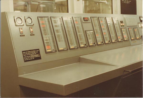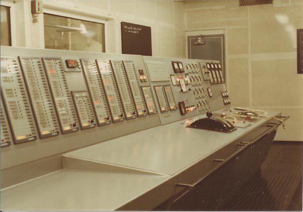 | These photos show the alarm panel and main engine controls in the control room. | ||