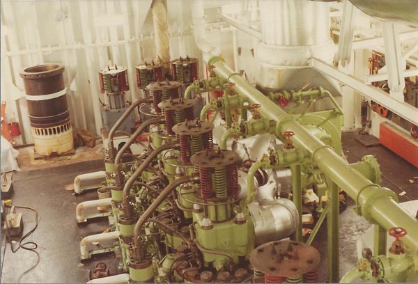 The photo left above is the bottom platform looking aft and the other photo is also on the bottom platform but looking forward. The photo on the right is the main engine forward turbo-blower. All photos copyright © Reardon Smith Ships. |