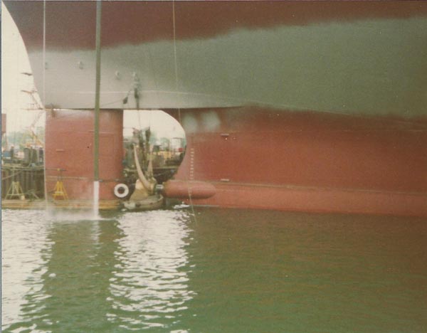 | The ship is ballasted down by the head so the stern tube is clear of the water. The propellor shaft was only pulled in far enough for the propeller to be removed. | ||