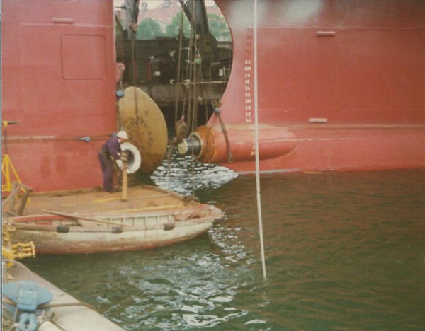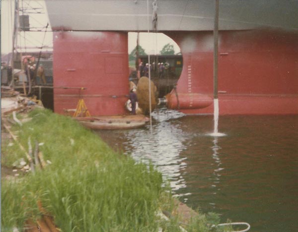 | The propeller is rigged so that it can be lifted out by the shore crane. | ||