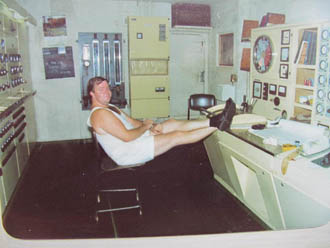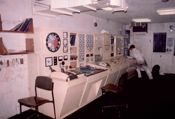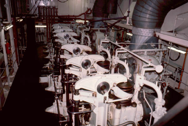 | Engine control room and a view of the top of the main engine. Copyright © John Howell. |