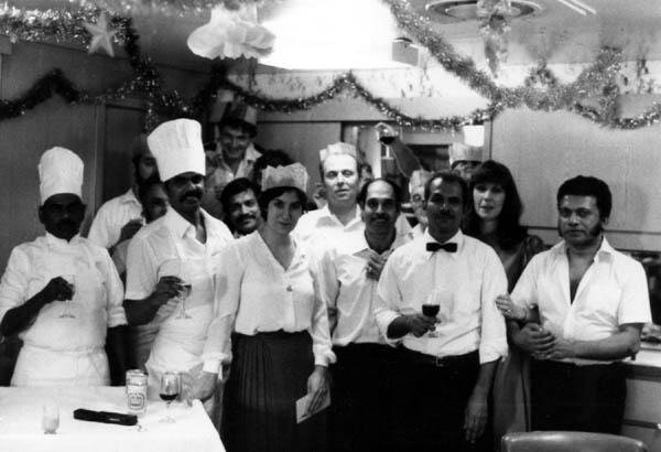 Christmas 1983, was my first trip. I am in the front row holding the table, Jim Scott & his wife Patricia (lady with long hair), at the back standing on a chair is the third deck officer Dave Williams, and showing the wine glass is Steve Broderick. We had indian crew. Carolina Keast.