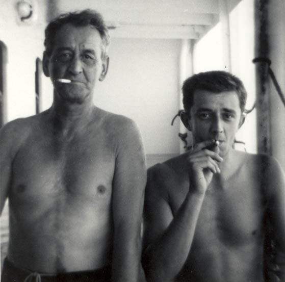 October 1965, in the famous Zillertal Hamburg. Centre Willie Munro 2/E. Mid row, Jim Murray C/O, Ian Mouat J/E, Ken Rowbottom 4/E, Calum Turner lecky. Front row Marjorie Murray, Sid Barnish Cadet, Dave Hall Cadet.. Copyright © Callum Turner. |