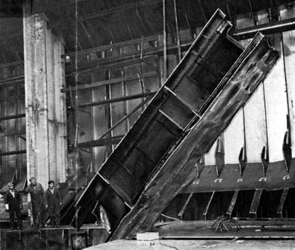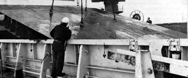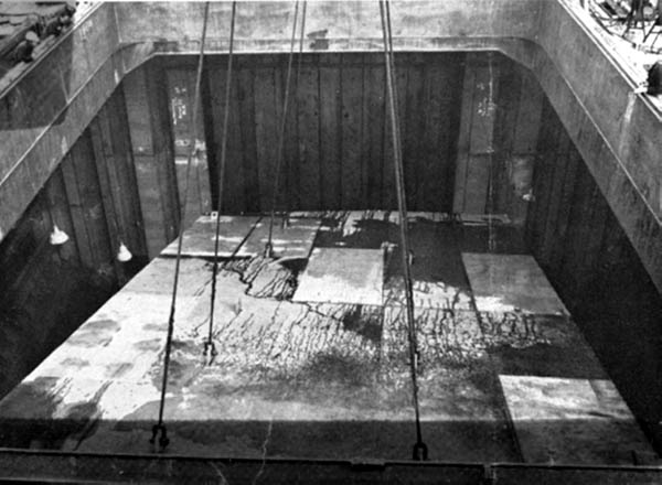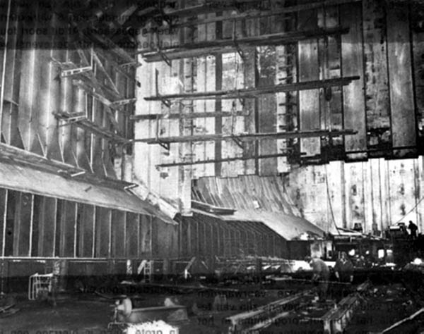 | Large ection of the damaged No.3 double bottom tank being removed. | This photo is taken from the drydock bottom after the old steelwork has been removed. | |