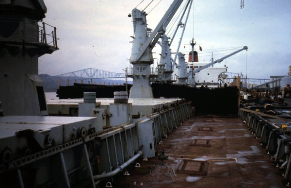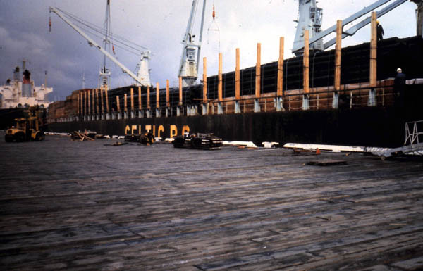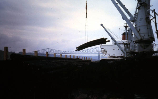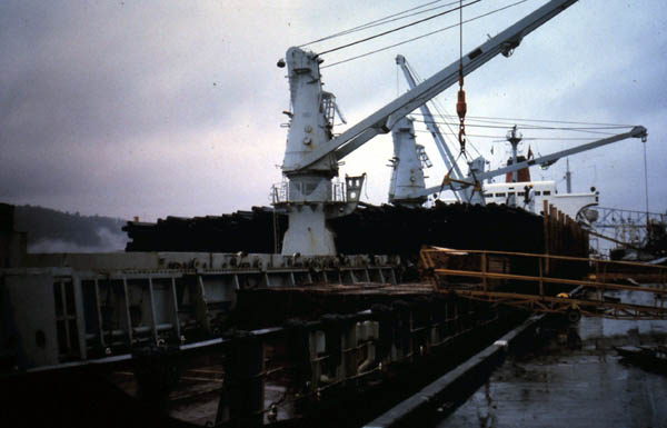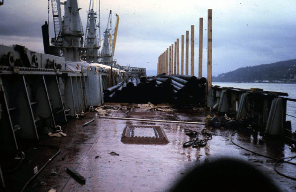 These photos on this page and the next page shows how the deck cargo of pilings shifted in May 1981 and the vessel had to go to Coos bay for this part of the deck cargo to be restowed.