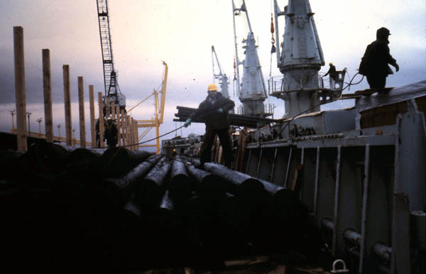Loading deck cargo of deck pilings   Loading deck cargo of deck pilings
