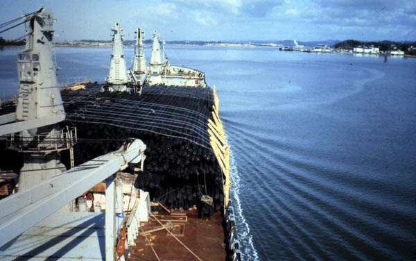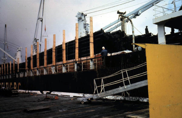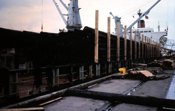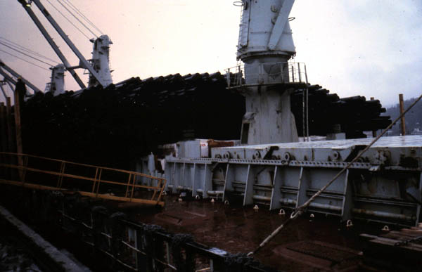 These photos on this page and the previous page shows how the deck cargo of pilings shifted in May 1981 and the vessel had to go to Coos bay for this part of the deck cargo to be restowed.