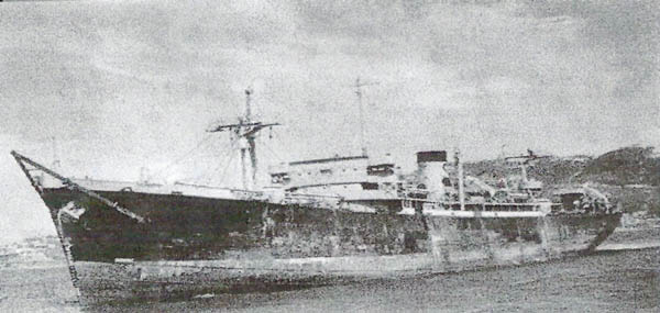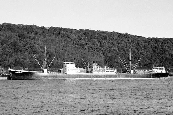 | M.V.Vancouver City at Aukland, NZ., January 1946. Paravane frame, gun mountings and rafts still in place. Copyright © Oliver Lindsay. |
