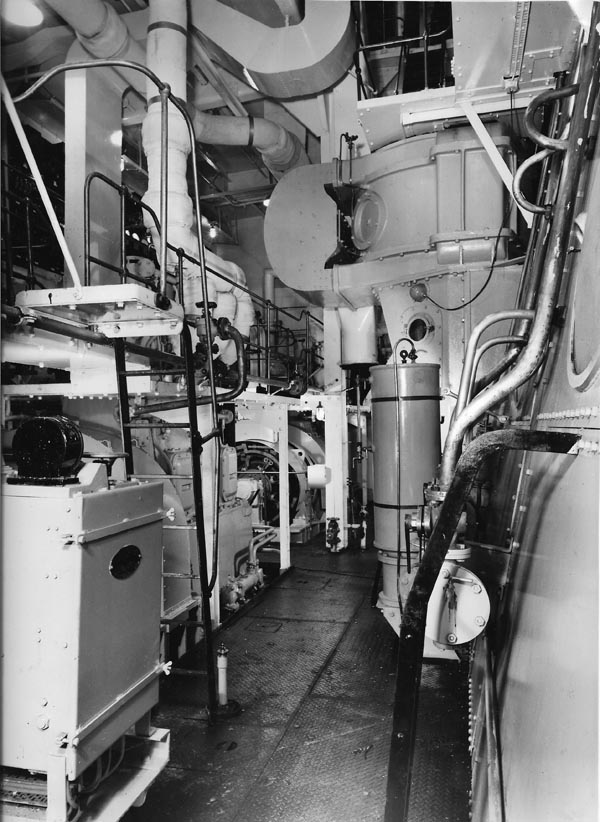 | Looking forward on generators and back of main engine. Distiller water de-aerator or right foreground. Photos from the collection of the late Alec Osborne. Copyright © Reardon Smith Ships. |