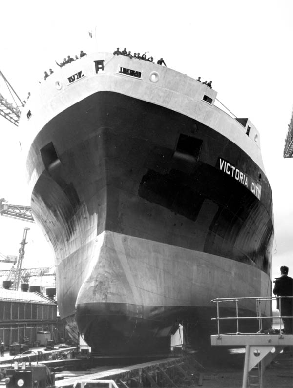 | These two photos show the Victoria City being launched 1969. Copyright © Reardon Smith Ships. |